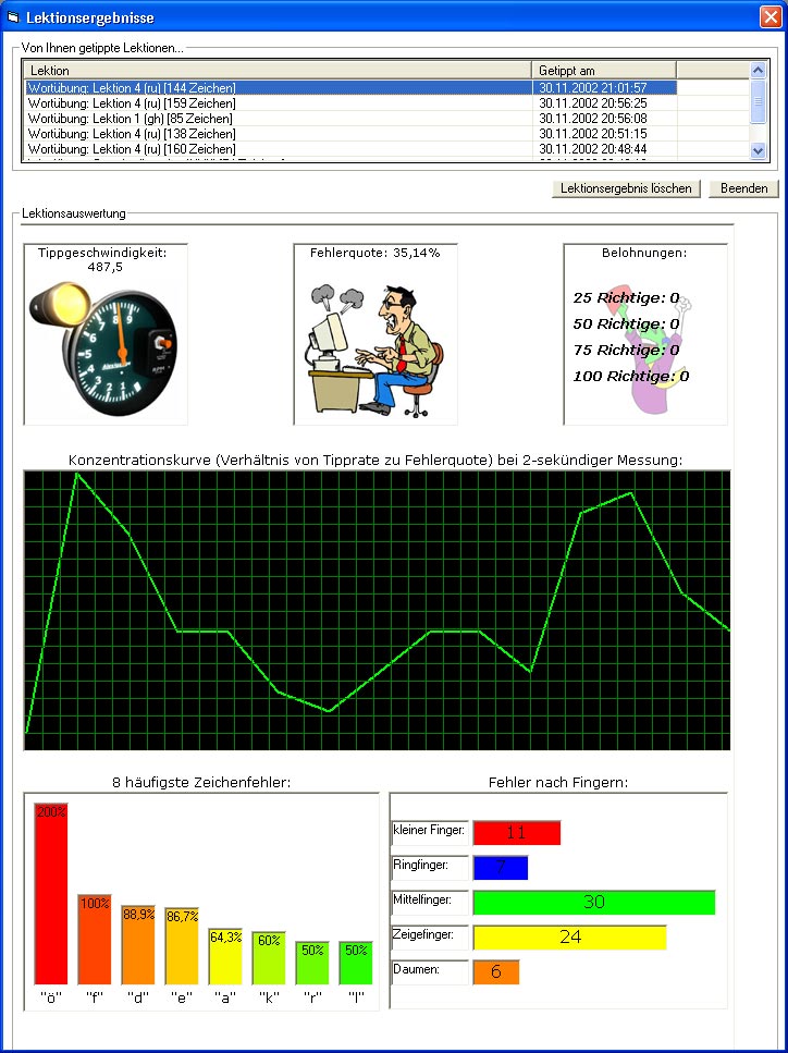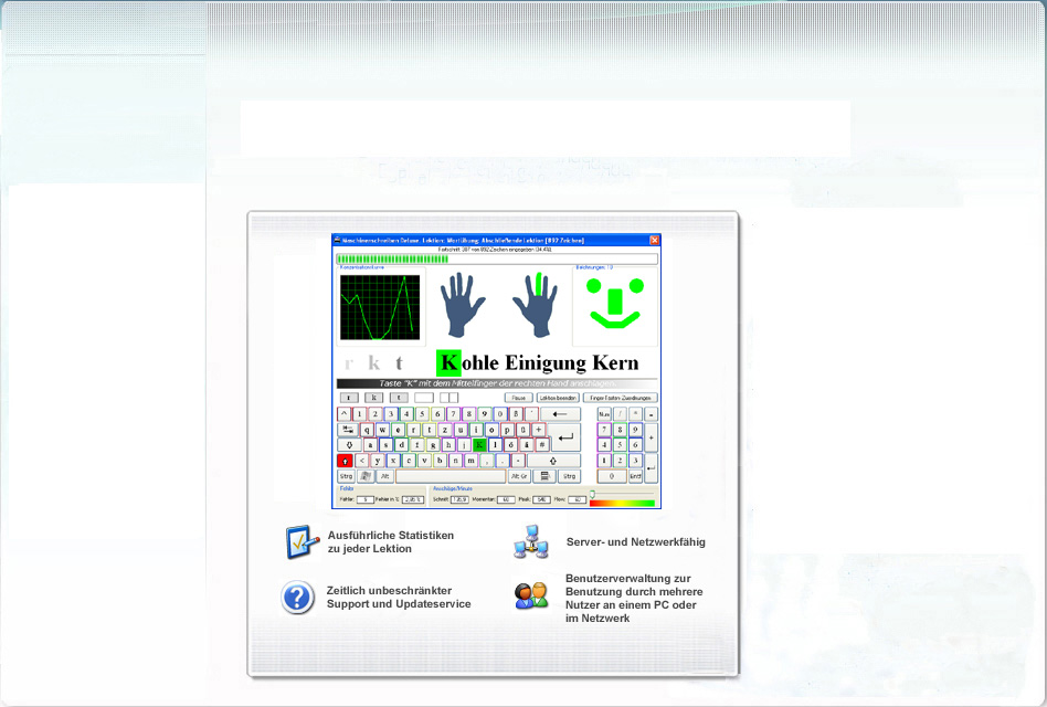 Dieses Programm lehrt in 19 Lektionen das Maschinenschreiben. Für abwechslungsreiches und effektives Training sorgen 5 unterschiedliche Lektionstypen, detaillierte Ergebnisanalysen, Präsentationsmodi, uvm. So können Sie beispielsweise die Grundgriffe üben, eine aufbauende Lektion tippen, speziell für eine Übung vorgesehene Wörter eingeben, anhand einer selbstgemachten Lektion Ihre Tippfähigkeiten verbessern, oder eine Geschichte abtippen. Ebenfalls steht Ihnen ein Freischreiben-Modus zur Verfügung, der es ermöglicht, eMails, Briefe und Dokumente zu erstellen; gleichzeitig wird Ihre Tippgeschwindigkeit gemessen, sodass Sie sich einen Überblick über Ihre reellen, praktischen Tippfähigkeiten machen können. Ganz nebenbei werden Ihre Lektionsergebnisse gespeichert, sodass Sie Ihren Lernfortschritt analysieren und vergleichen können. Zu jeder Lektion steht für Sie eine Animation bereit, die Ihnen den korrekten Tastenanschlag demonstriert. Zum Download von Maschinenschreiben Deluxe hier klicken.
